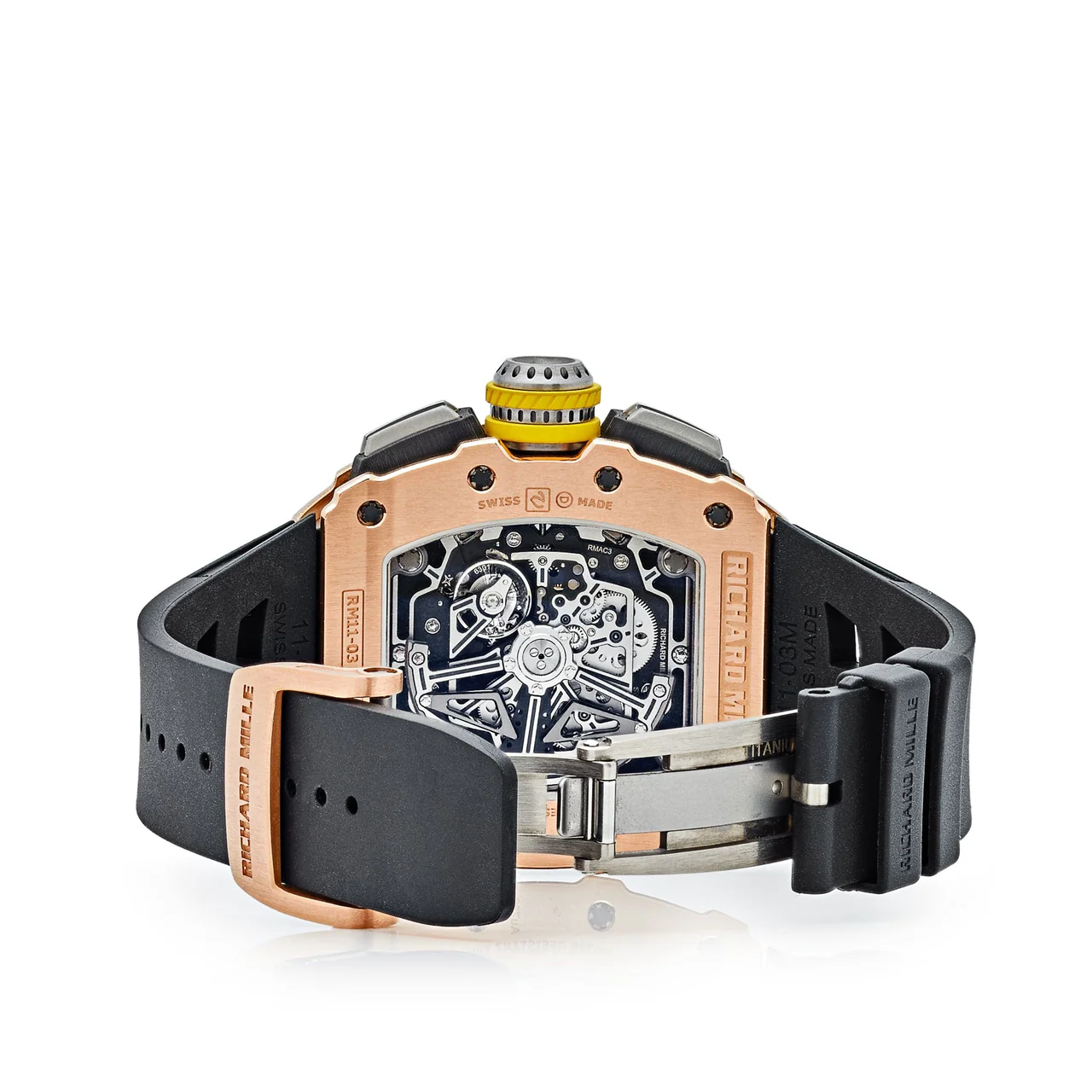 Embodying the essence of performance and elegance, the RM 11-03 stands as a testament to Richard Mille's unparalleled craftsmanship. This timepiece, housed in a robust 50mm rose gold case and complemented by a sporty rubber strap, exudes a captivating aura of sophistication.