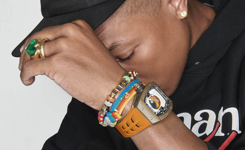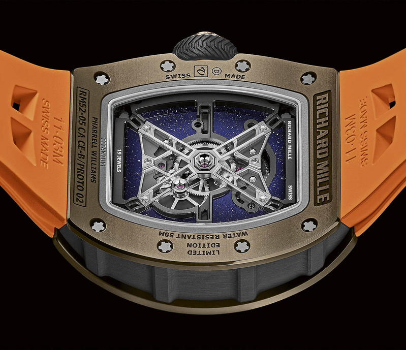 The Richard Mille RM 52-05 Manual Winding Tourbillon Pharrell Williams draws inspiration from the concept of Space and Mars. The 49mm case comes in brown Cermet, a material that marries the lightness of titanium with the hardness of ceramic. The case band is made of Carbon TPT, a well-known component in the field of aerospace, fitting right in with the celestial details of the piece. Even the crown draws on the space theme as the design of a rocket capsule while the rubber surrounding it sports a distinctive profile of a Martian Rover tyre.