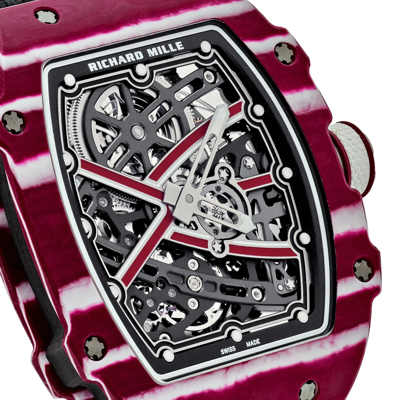 The RM 67-02 boasts a sleek 39mm case meticulously crafted from Quartz TPT and Carbon TPT, resulting in a durable yet lightweight construction that is shock-resistant and ideal for high-intensity activities. Engineered for precision and reliability, this timepiece is the perfect companion for athletes and enthusiasts alike, offering unparalleled performance in any setting.