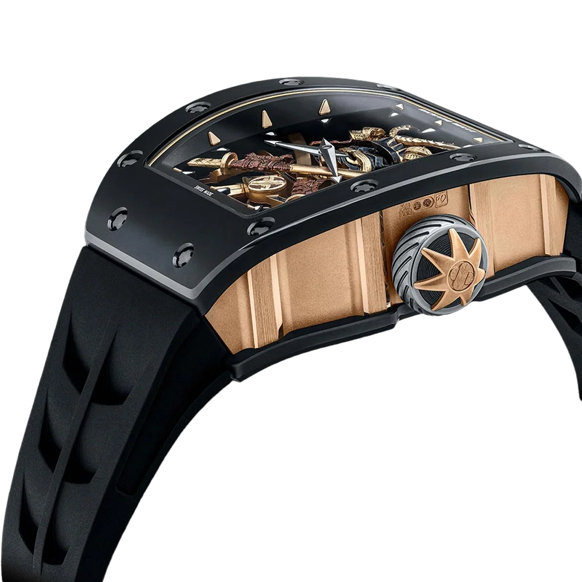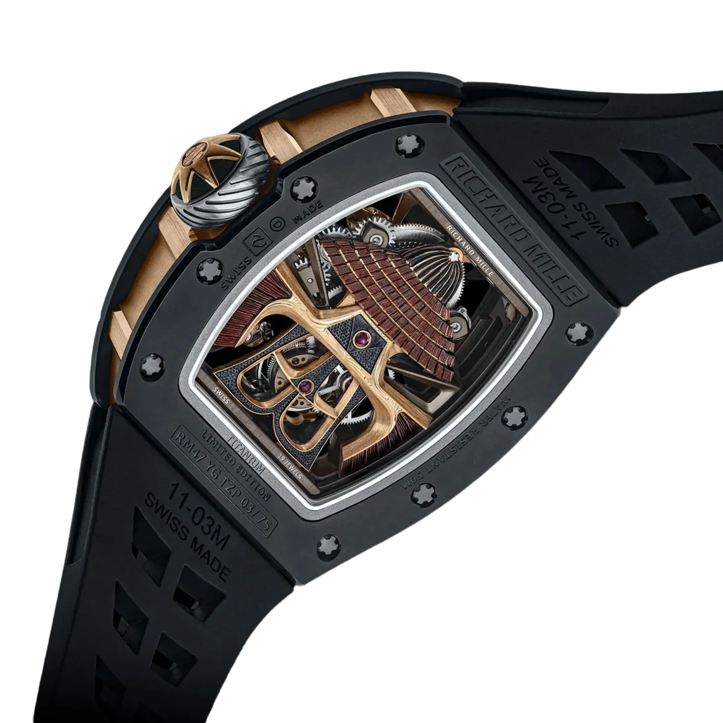 In total, it took no less than 16 hours of engraving and 9 hours of painting – in all, more than a whole day – to obtain the 11 components that make up the Samurai. Like a guardian, the armour provides precious protection for the manual-winding calibre RM47 with hours and minutes. To ensure optimal functioning of the movement, the baseplate and skeletonised bridges are made of grade 5 titanium, a biocompatible alloy often used in the aerospace industry, with a black PVD treatment. This combination offers high corrosion-resistance, remarkable rigidity and perfectly flat surfaces.