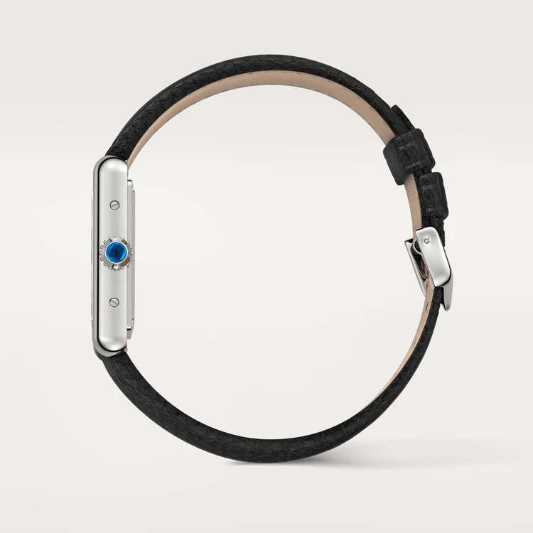 Luxuriously refined in stainless steel with a small size, this Tank Must features a black leather strap for a sleek finish.