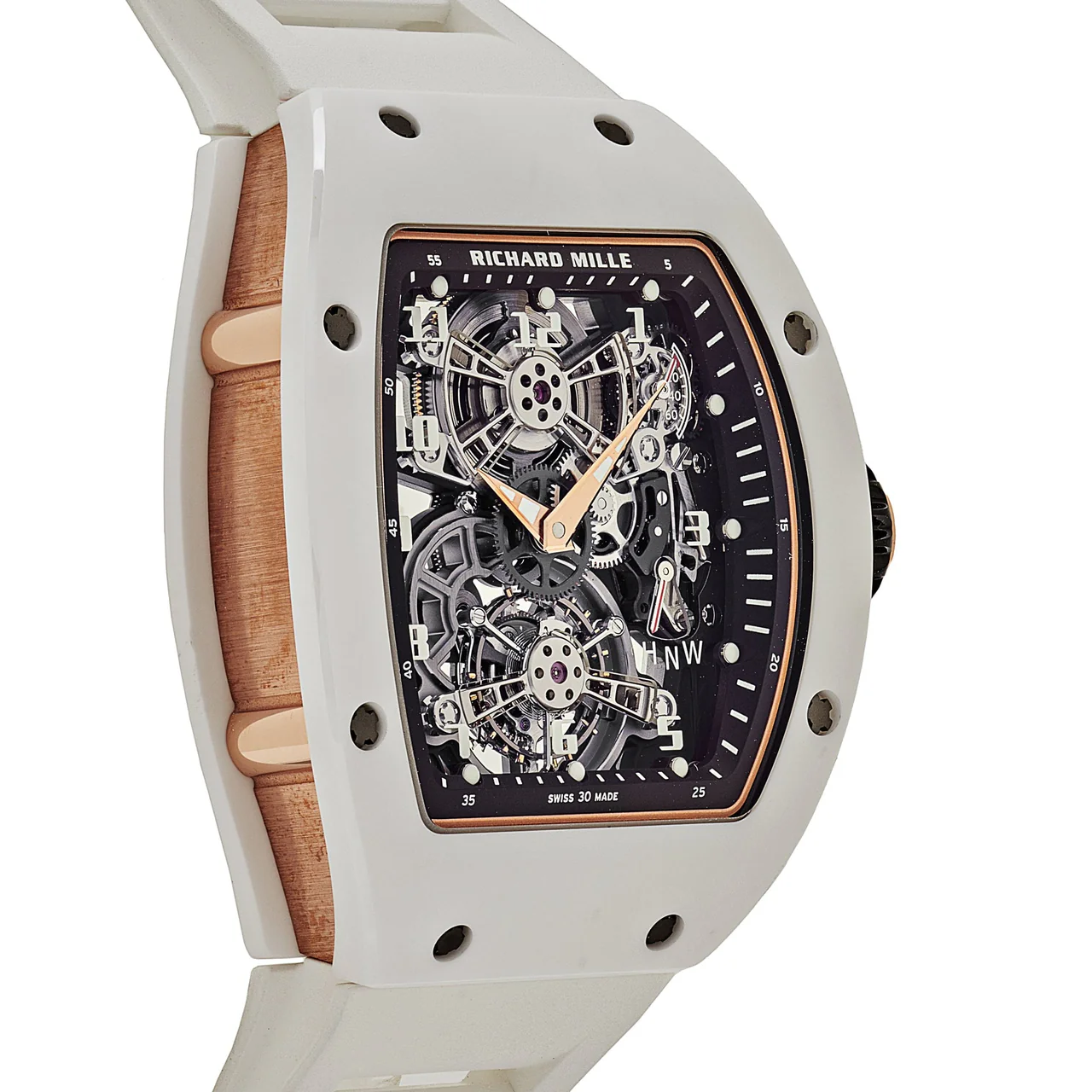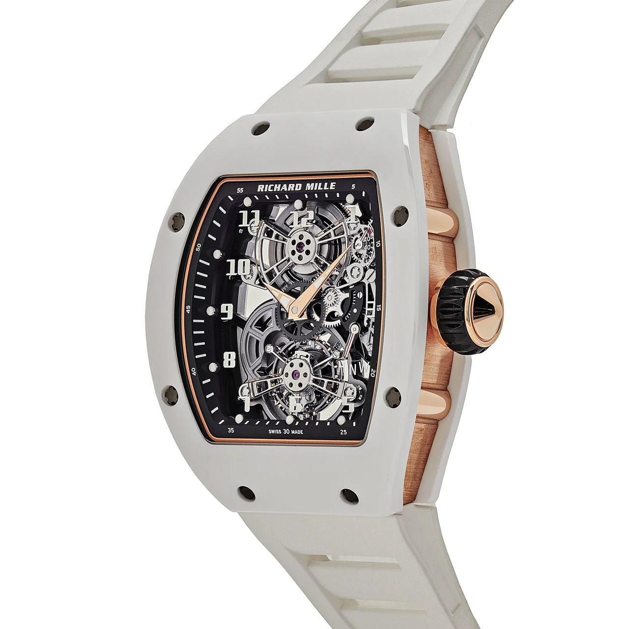 The Richard Mille RM 17-01 in white ceramic and rose gold is a manual-wind tourbillon watch that exemplifies high-end watchmaking. The watch features a distinctive tonneau-shaped case crafted from durable white ceramic, which is both scratch-resistant and lightweight. Contrasting beautifully with the white ceramic is the warm rose gold that adorns the sides of the case adding a touch of elegance and luxury.