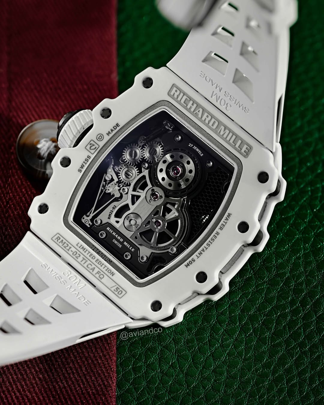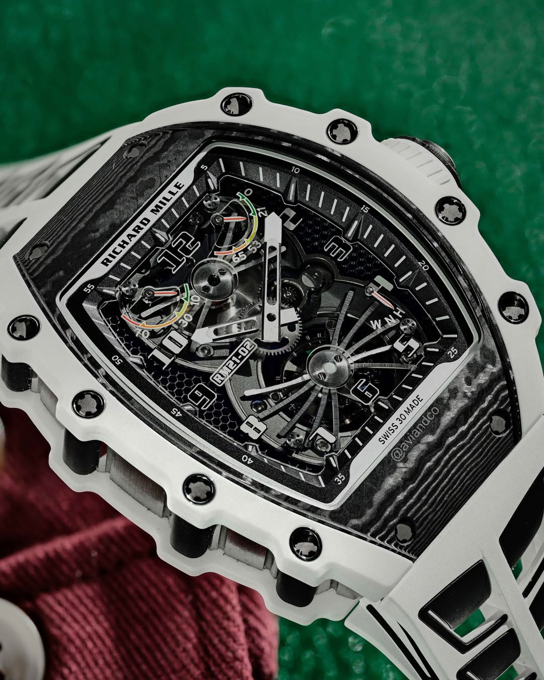 The design and construction of the RM 21-02 Aerodyne represents a holistic approach to the creation of the movement, case and dial. Everything is built to extremely strict specifications. The case ring is removed and the movement is secured to the case with four grade 5 titanium screws and a silent block (ISO SW).